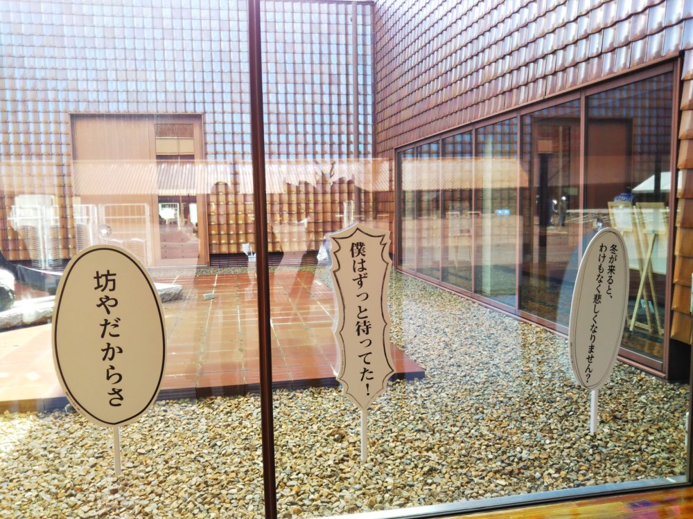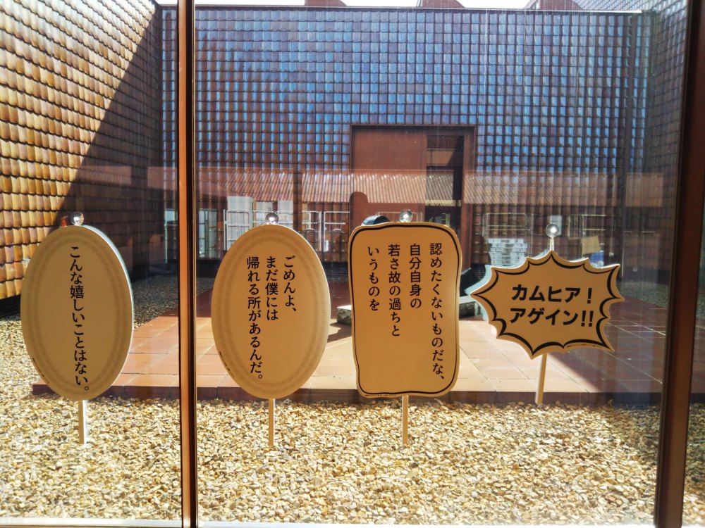 当然ではあるのでしょうが、展示室の中は撮影禁止でした。唯一撮影できたのは、廊下にあるダイターン3とフィギアとガラス窓に貼ってある「名言集」でした。この名言集は吸盤で止めてあるので取り外して手に持って写真を撮るようになっています。さすがにそこまでは望みませんが。