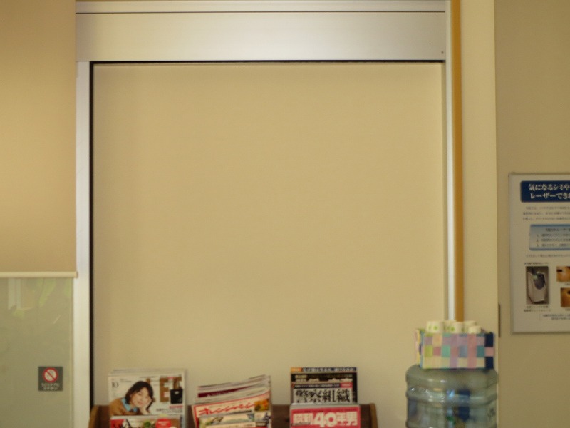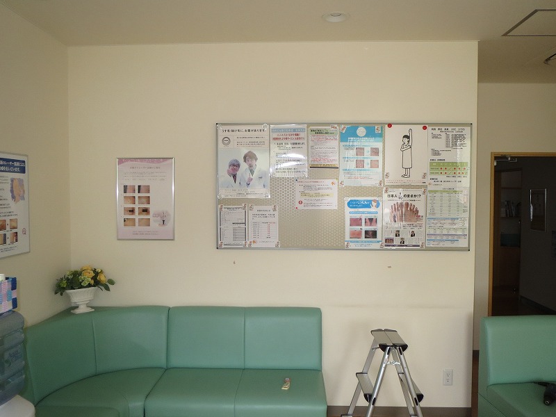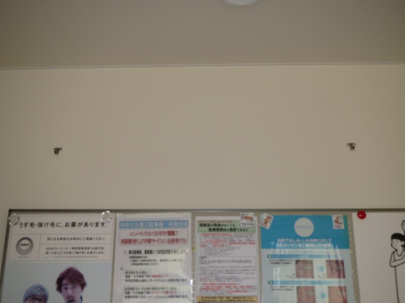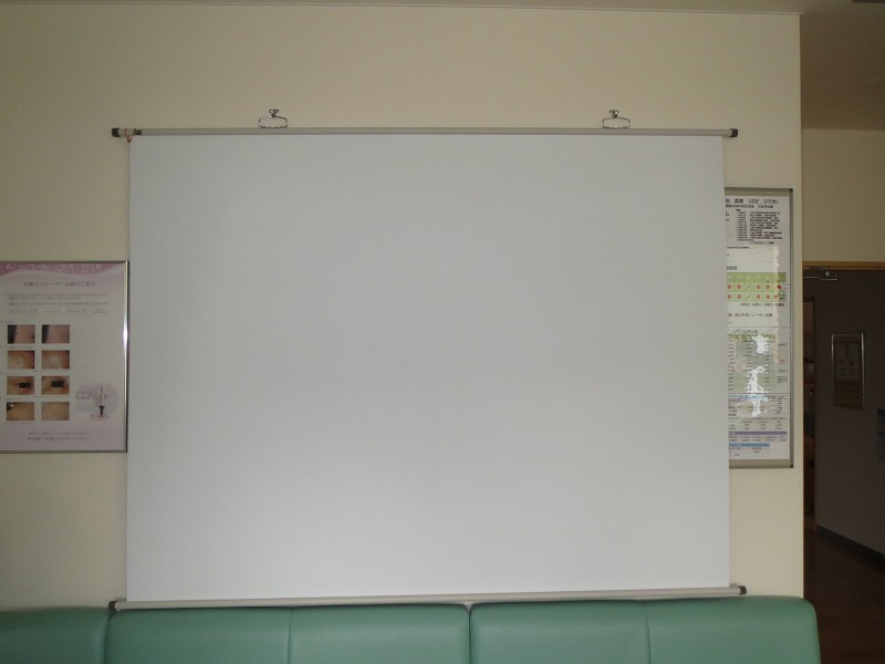 ただ、ここだと下のソファーに患者さんが座られるので、常時設置してもし落ちてきたら裁判ものです。ですので、スクリーンは使用するときだけ掛けることにしました。