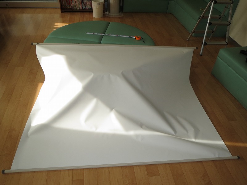 送られてきたのがこのスクリーンです。思ったより、大きかったです。巻き上げされないのはちょっと不便ですが、返礼品ですので文句はありません。