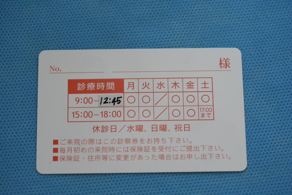 元々の診察券の裏面です。午前の診察時間を13:00にしていましたが、ホームページの受付時間は12:45と記載していました。しかし、受付時間=診察時間と思われるので、診察時間も12:45に変更しました。