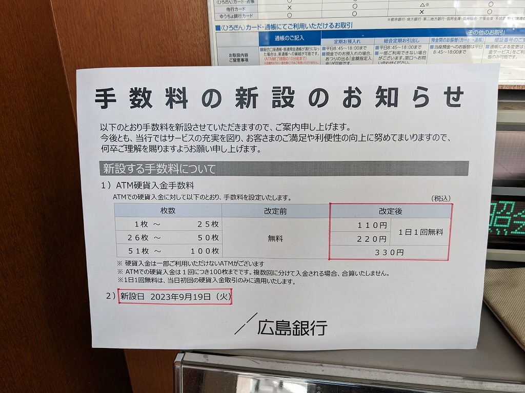 9/19(火)からATMで硬貨を入金すると手数料が必要になるようです。