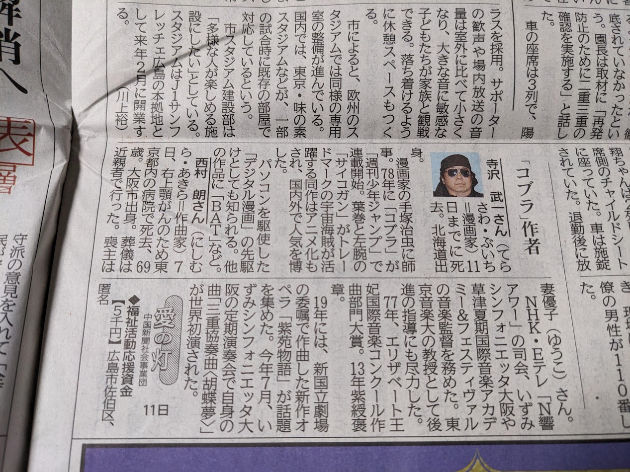 一昨日の新聞に漫画家の寺沢武一さんが亡くなったとの記事がありました。