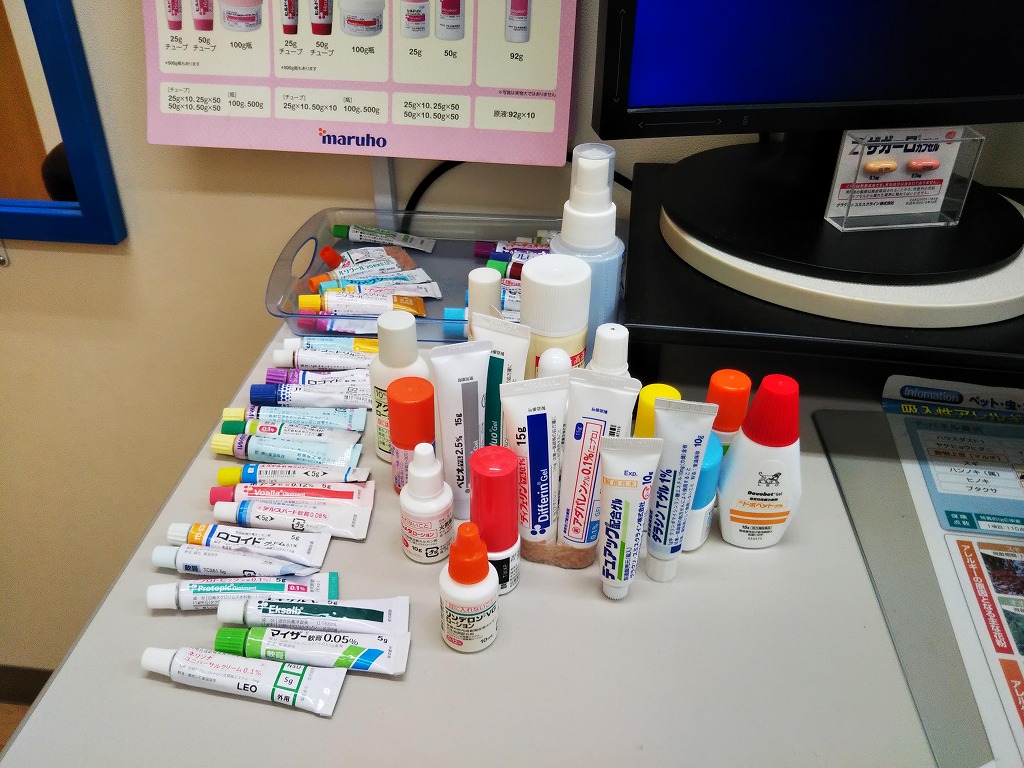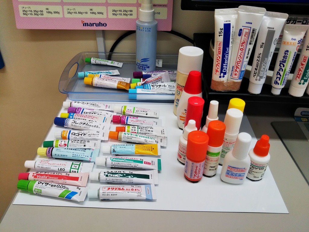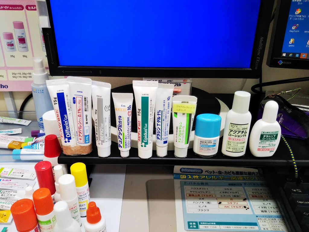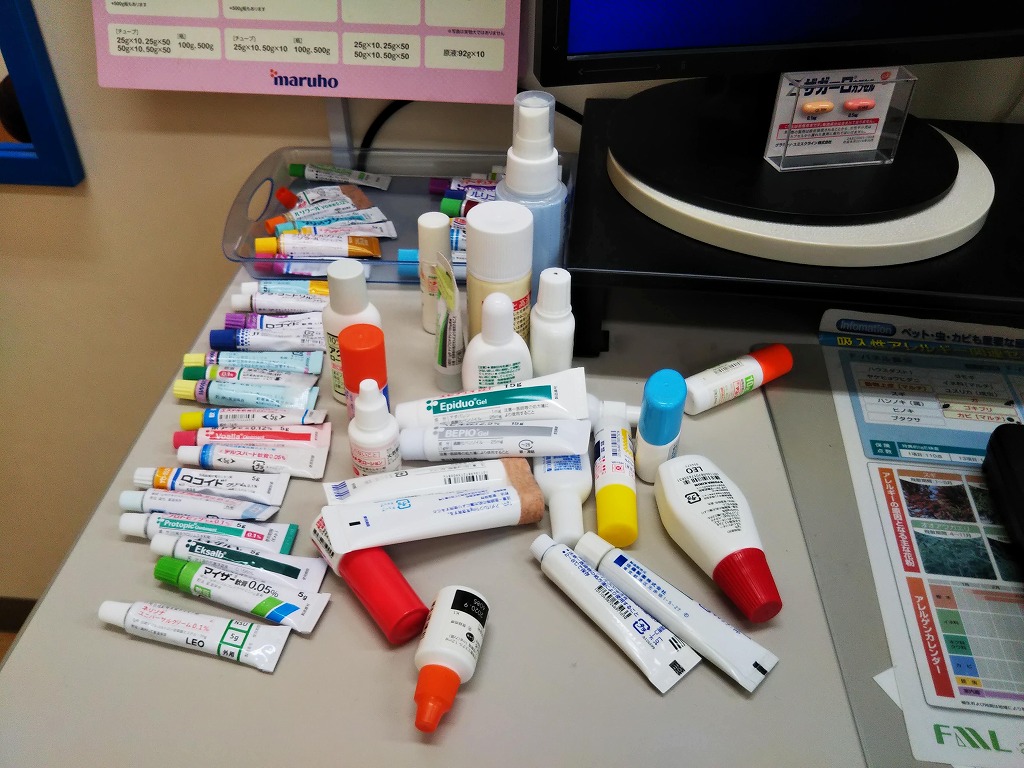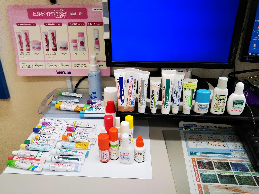 皮膚科なので、数々の外用剤を机の上に置いています。