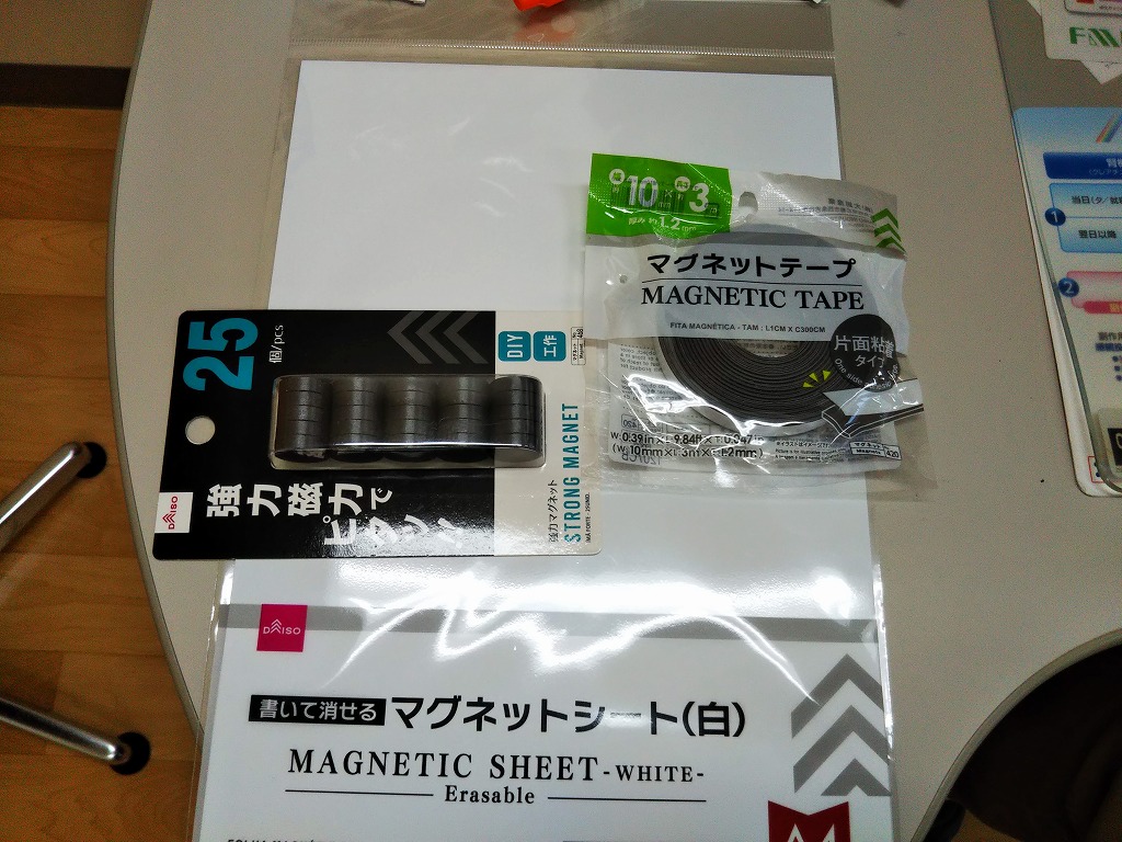 なので、なにかいい手はないかなと考えました。ダイソーでマグネットシートと磁石(円錐状のものと切って使うテープ状のものです)を買ってみました。
