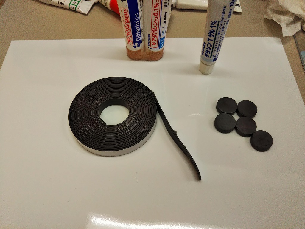 その上から適当に磁石を切ってから貼り付けます。磁石自体にも両面テープが貼ってありますが、外用剤の裏に凸凹があるので、それだけでは粘着力が足りません。