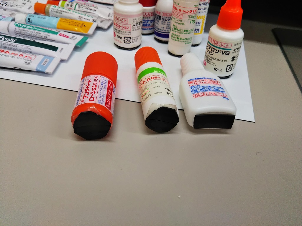 実際これらの外用剤を患者さんに塗布することはないのですが、説明するときの見本にしているという感じですね。