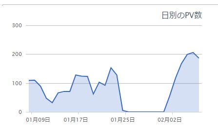 上のグラフがこのブログのアクセス数です。だいたい1日100件前後のアクセスがあるのですが、1/25-2/2の間はアクセスが0です。