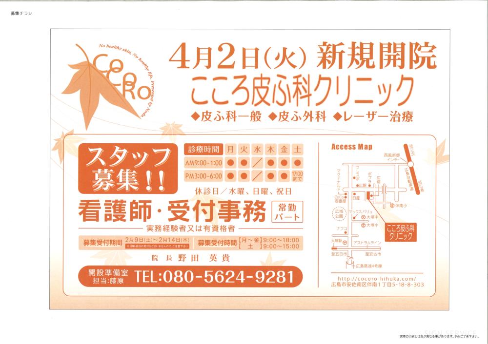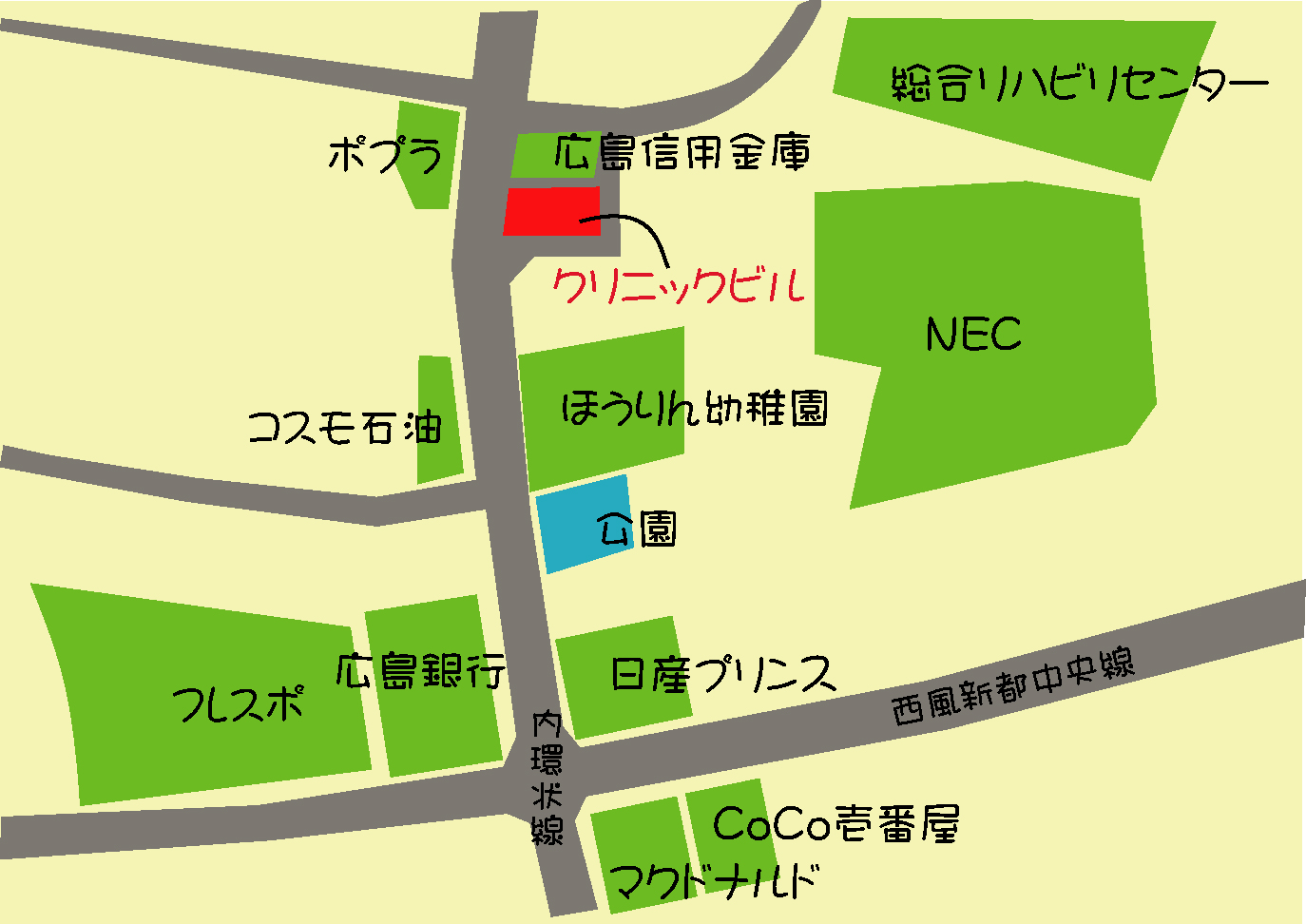 2/1にハローワークに求人と登録しました。 ゆめビルの中の掲示板にも求人のポスターを掲示しました。 そして、2/8には伴、五月が丘、湯来、五日市など、19000部の求人チラシが入ることになりました。 そして、2/16に面接の予定です。 誰もが言われることは、「看護師さんの応募はないよ」ってことです。そうなんでしょうね。 なんとか、応募があることを期待します。 診察日はこの通りです。水曜日は終日休みです。 クリニックの場所は上の図の如くです。 いずれも、イラストレーターで書きました。ロゴマークを作ったおかげで、ずいぶんイラストレーターに慣れてきました。