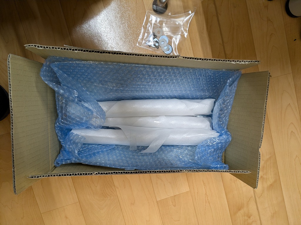 最初の予定では、下向きに爪をつけた棚を上にも設置して、上下の棚で挟み込むようにしようと思っていましたが、そこまでしなくても下の棚だけで十分箱をホールドできるようです。